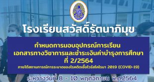 กำหนดการมอบอุปกรณ์การเรียน เอกสารทางวิชาการ และการชำระเงินค่าบำรุงการศึกษา ภาคเรียนที่ 2/2564 ระหว่างวันที่ 8 – 10 พฤศจิกายน 2564