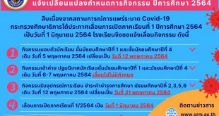 สืบเนื่องจากสถานการณ์การแพร่ระบาด Covid-19 กระทรวงศึกษาธิการได้ประกาศเลื่อนการเปิดภาคเรียนที่ 1 ปีการศึกษา 2564 เป็นวันที่ 1 มิถุนายน 2564 โรงเรียนจึงขอแจ้งเลื่อนกิจกรรม ดังนี้
