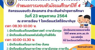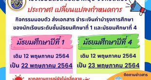 ประกาศเปลี่ยนแปลง วันมอบตัว ส่งเอกสารและชำระเงินค่าบำรุงการศึกษา ของนักเรียนระดับชั้นมัธยมศึกษาที่ 1 และมัธยมศึกษาที่ 4 ปีการศึกษา 2564
