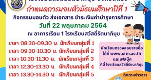 ประกาศรายชื่อและกำหนดการมอบตัว ส่งเอกสารและชำระค่าบำรุงการศึกษา นักเรียนชั้นมัธยมศึกษาปีที่ 1 วันที่ 22 พฤษภาคม 2564 ณ อาคารเรียน 1 โรงเรียนสวัสดิ์รัตนาภิมุข